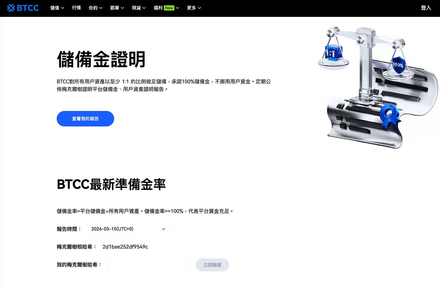 BTCC 自 2025 年起,每月定期發布儲備金報告(Proof of Reserves,PoR),採用默克爾樹(Merkle Tree)加密工具進行驗證,用戶可以在官網自行核對自己的資產是否納入儲備。2025 年 11 月報告顯示,BTCC 的整體儲備率為 146%,意即平台持有的資產遠超全體用戶存款總和。