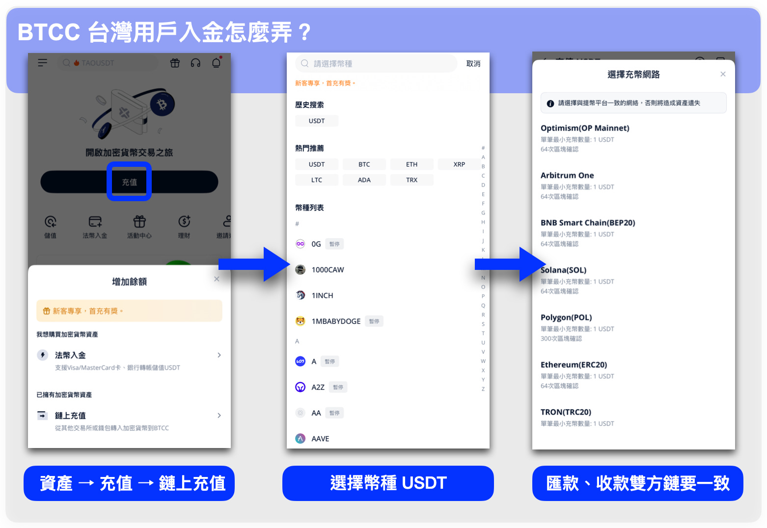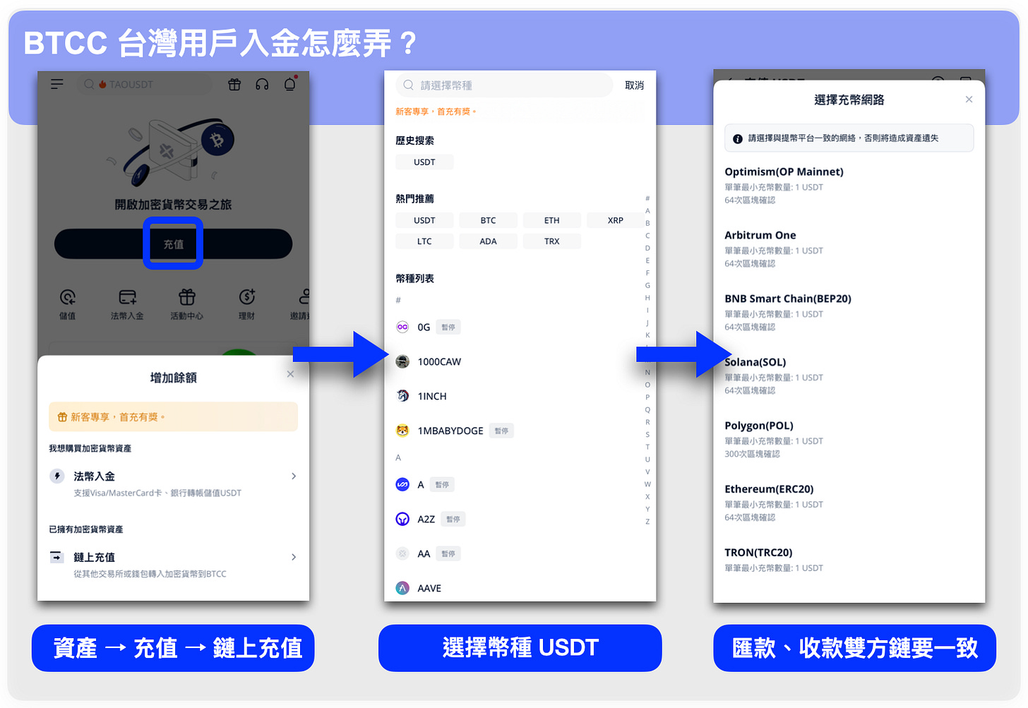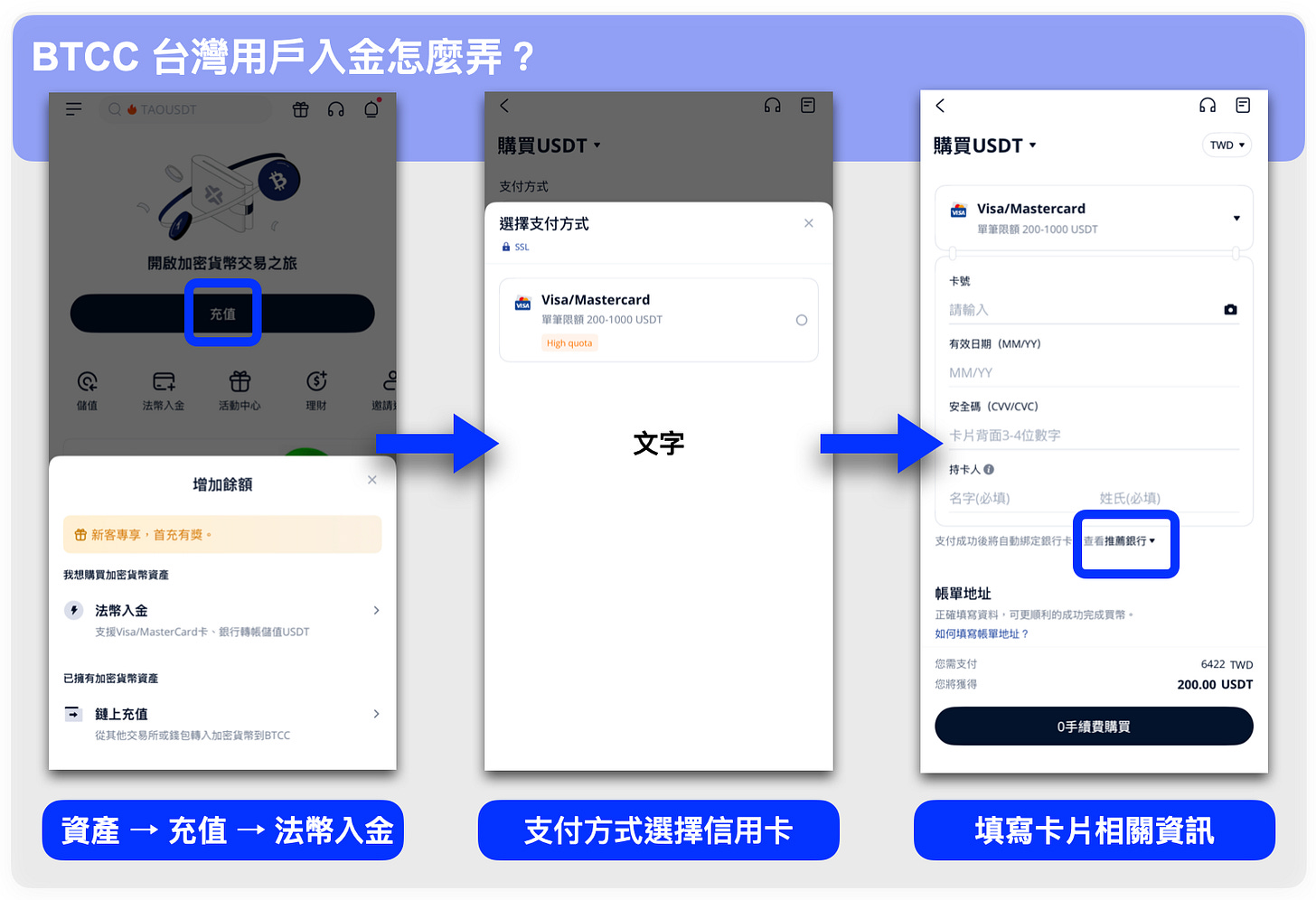 先在 BitoPro、HOYA BIT 或 MAX 等本土所以台幣購入 USDT,再透過鏈上轉帳充值至 BTCC。這個路徑的匯率和手續費較為划算,適合有一定操作基礎的用戶。
