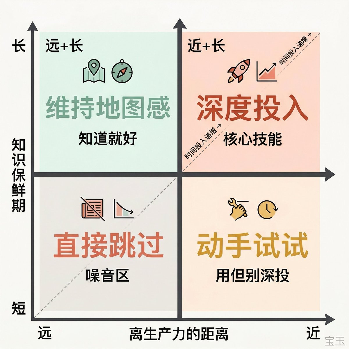 這張四象限圖給了一個很實用的判斷框架,用「生產力距離」與「知識保鮮期」來協助我們定位,對得上「近+長」的才值得深掘;其他的,知道就好,或直接跳過。