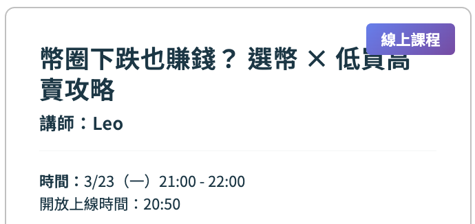 今晚 3/23(一)21:00 我在鏈習生公開課有一場免費直播,主題是聊選幣以及網格操作的觀念與操作,新手友善。很多別的地方聽不到的實戰經驗,且持續迭代中。