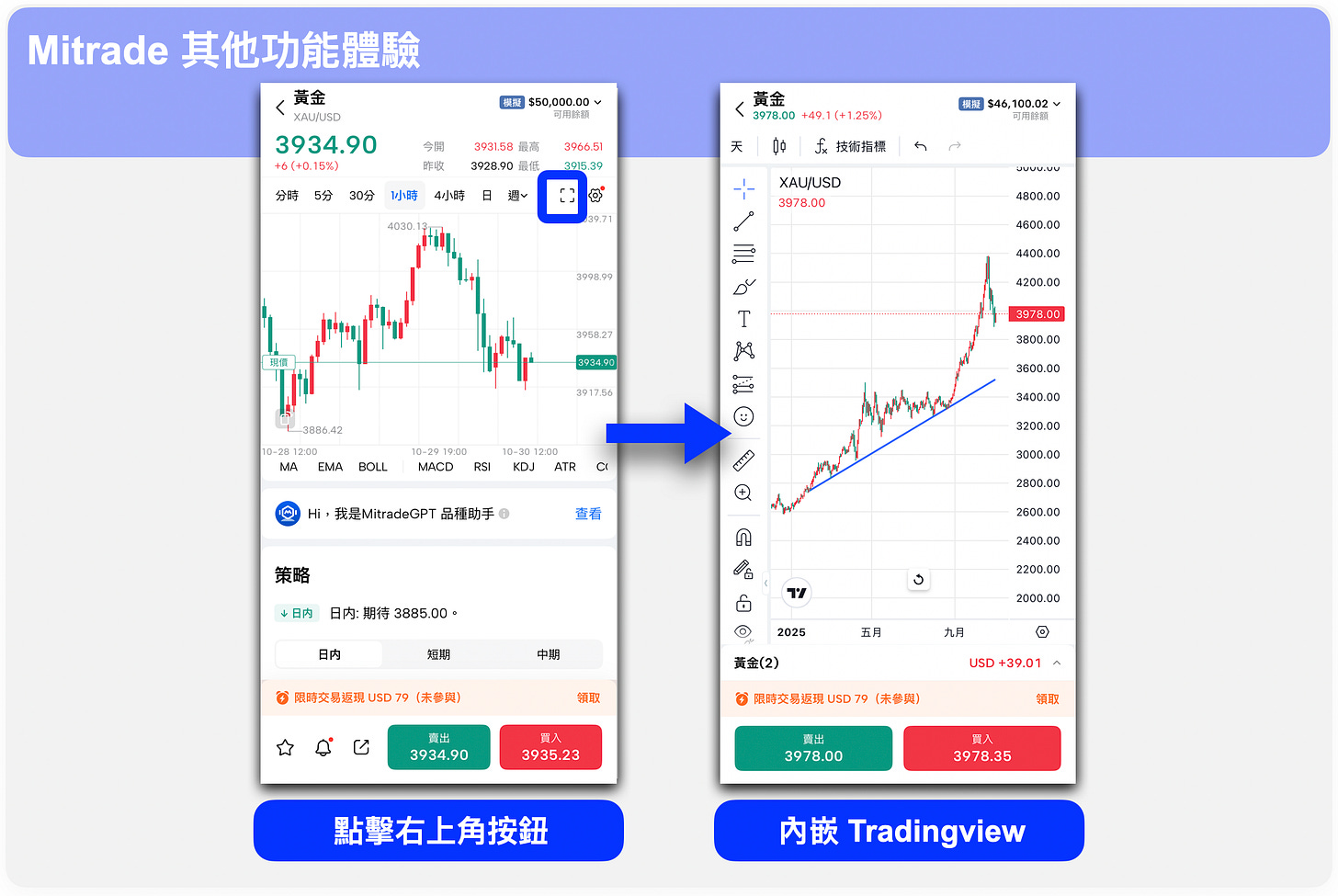 讓人驚喜的是,TradingView 直接內嵌在 Mitrade 平台裡,你可以在 App 裡的 K 線圖上直接畫線、標註,不需要另外切換軟體或打開 TradingView 網站。