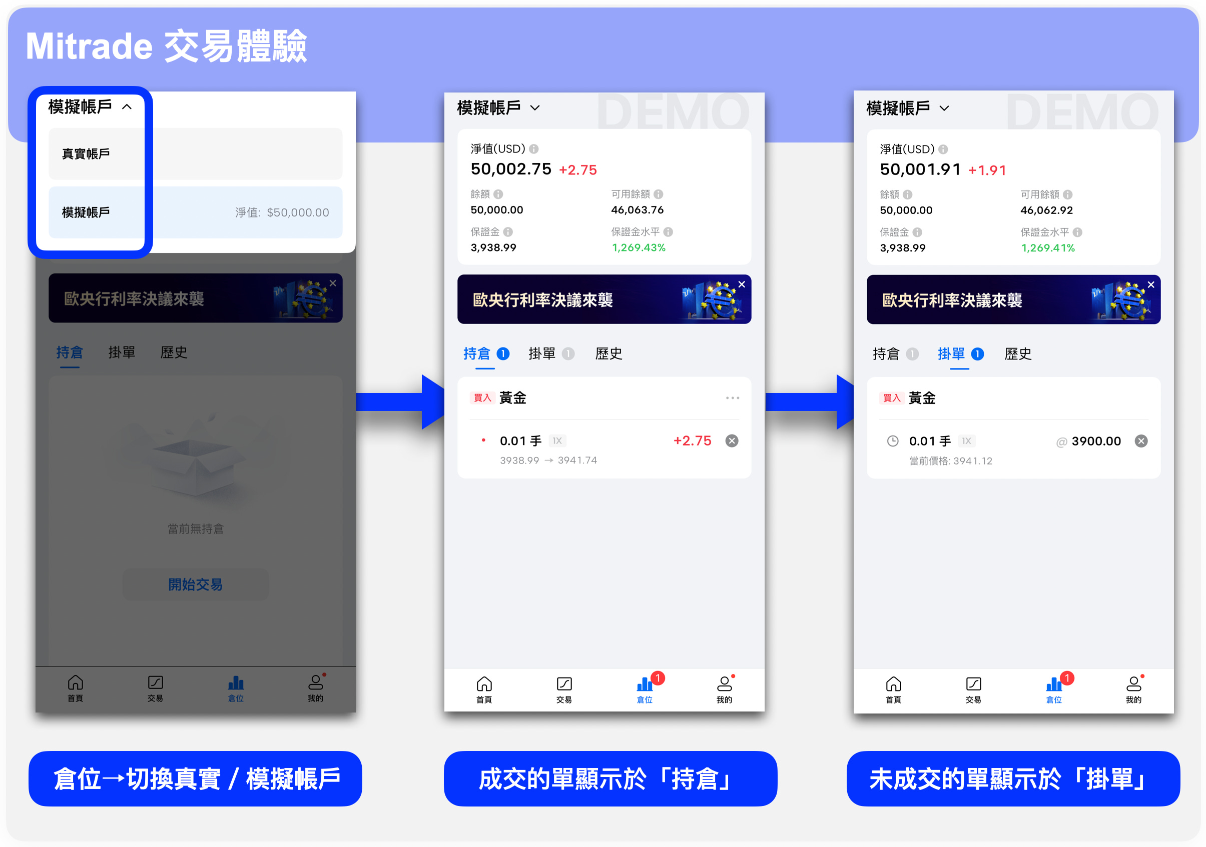 順帶一提,Mitrade 也提供免費的模擬帳戶功能,新手可以先用虛擬資金體驗交易,熟悉介面和操作方式,再進行「荷槍實彈」實盤操作。