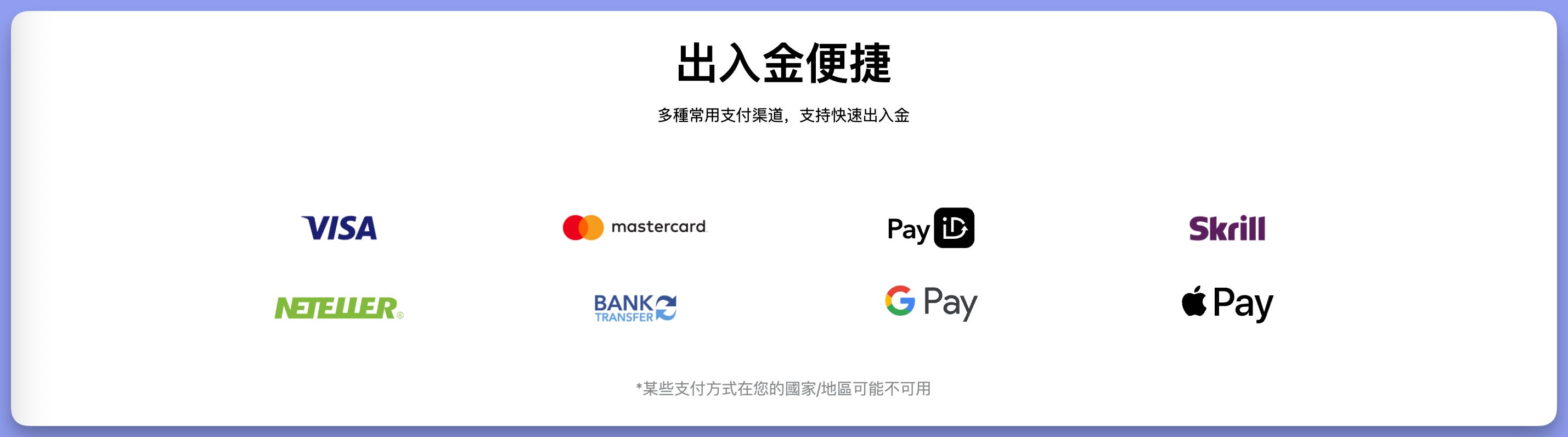 在 Mitrade 入金操作也相當方便,只要在 App 中點擊「我的 → 入金」即可選擇多種支付方式,包括 Visa/Mastercard、Apple Pay、國際電匯等。