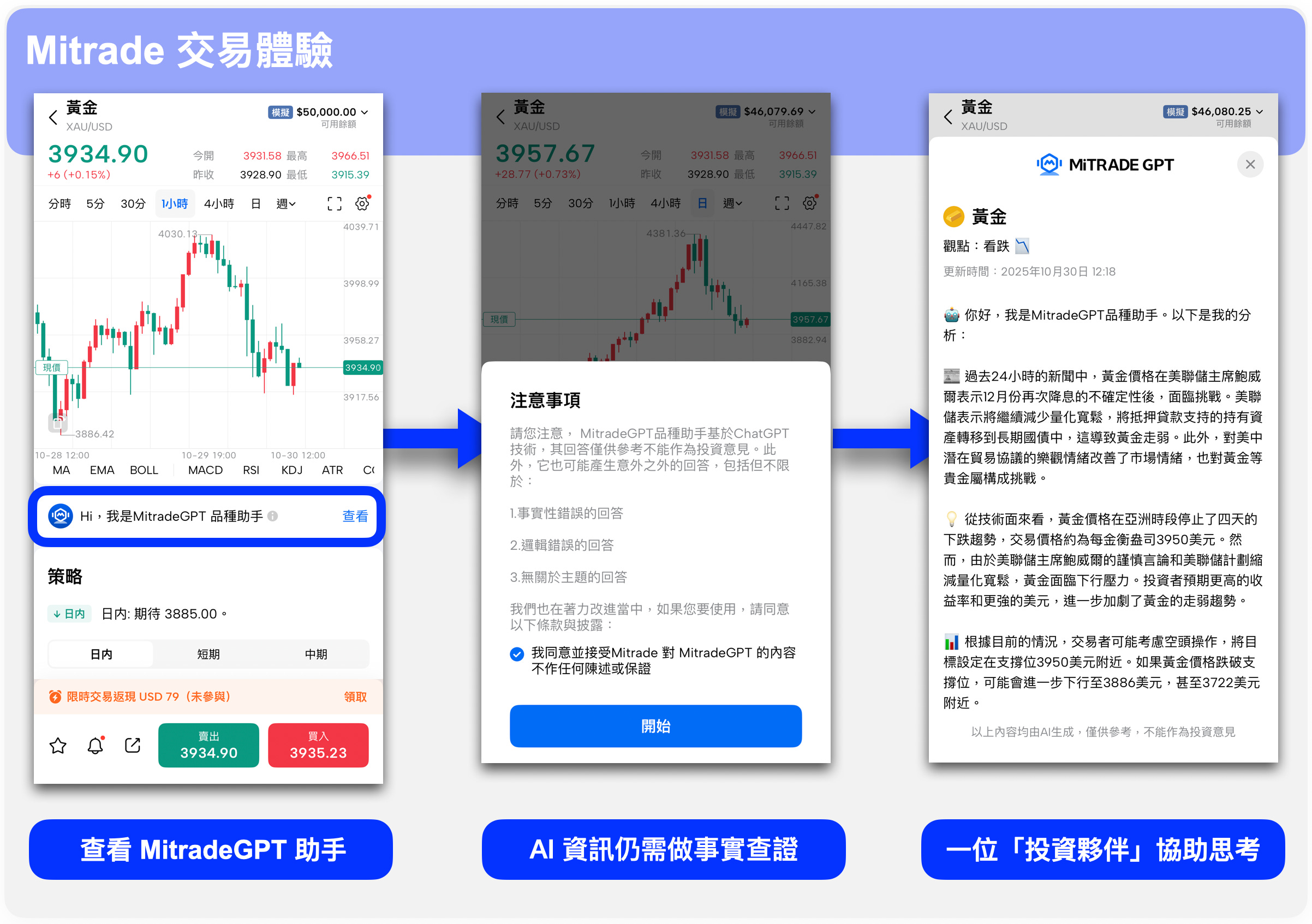 Mitrade 內建的 MitradeGPT 助手,可以透過對話即時提供市場分析與行情觀察。