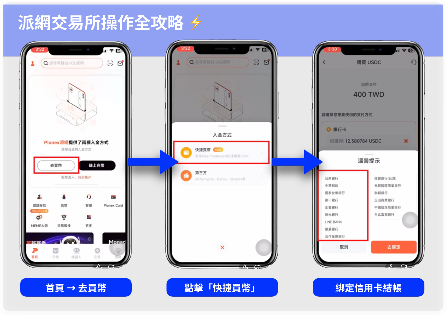 在台灣由於法規關係,不是每張信用卡都支援買幣(派網交易所蠻貼心,有溫馨提示你用哪些銀行發行的信用卡買幣比較容易過),如果被擋刷,就得換其他卡片試試看。