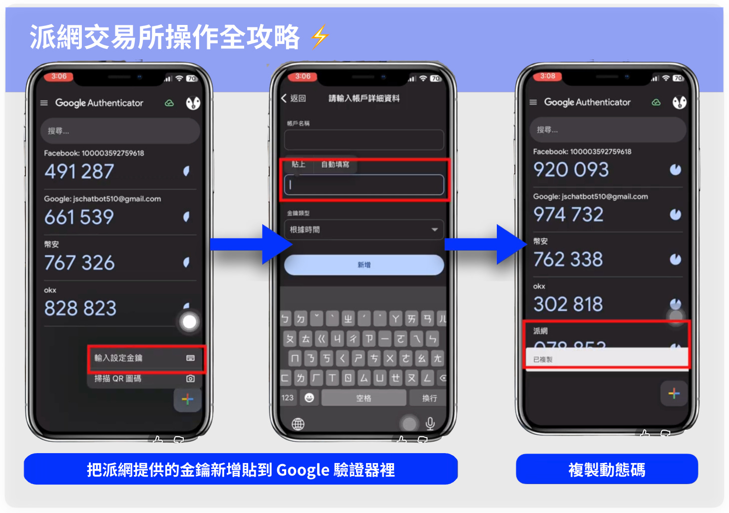 把派網提供的金鑰(Key) 新增貼到 Google 驗證器裡