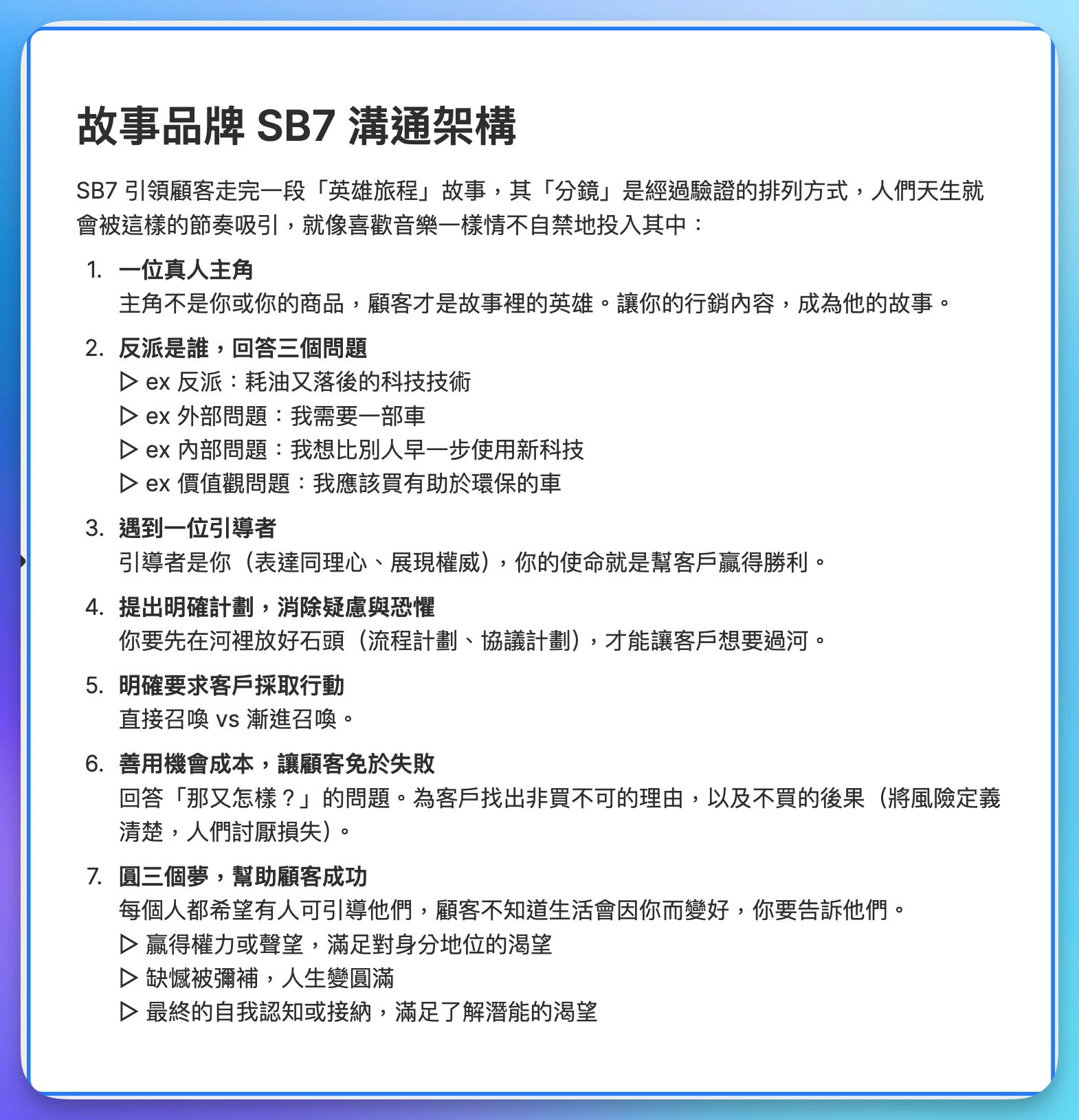 書裡有提到,當你在寫文案,或是那種想讓讀者看完後「動起來」的說明文時,主角千萬不能是你自己、不是作者、不是公司,更不是產品。顧客才是這場戲裡的英雄,你的行銷內容要寫得像是他的故事一樣。我那時候針對這個溝通架構整理了一份筆記,放在這邊給大家參考。