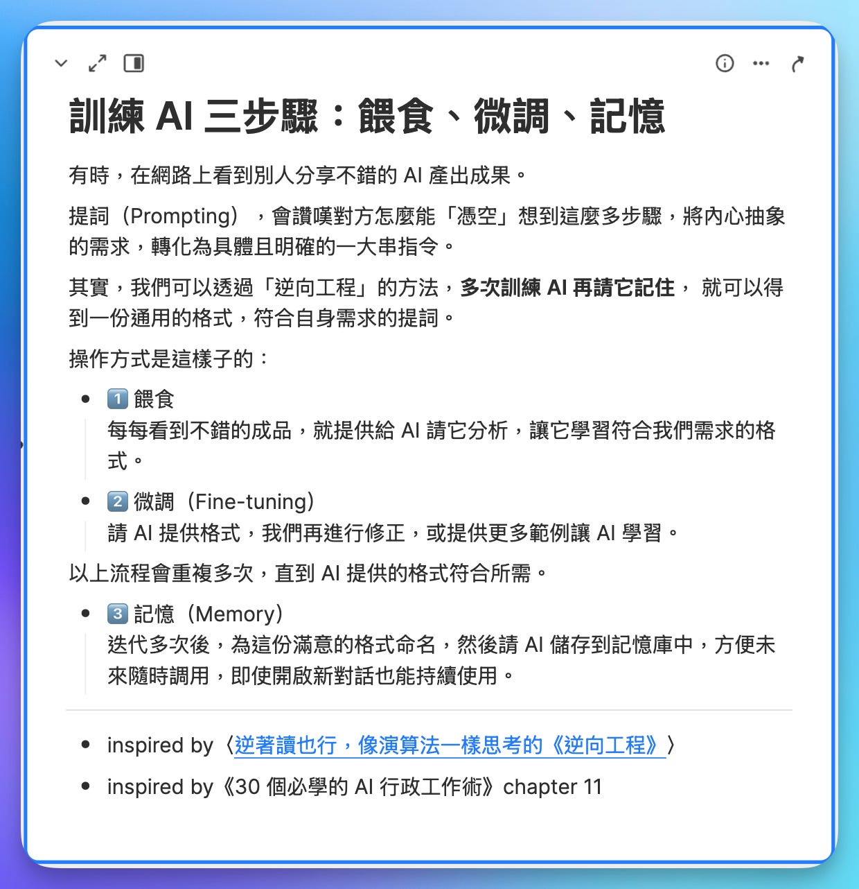 其實,我們可以透過「逆向工程」的方法,多次訓練 AI 再請它記住, 就可以得到一份通用的格式,符合自身需求的提詞。
