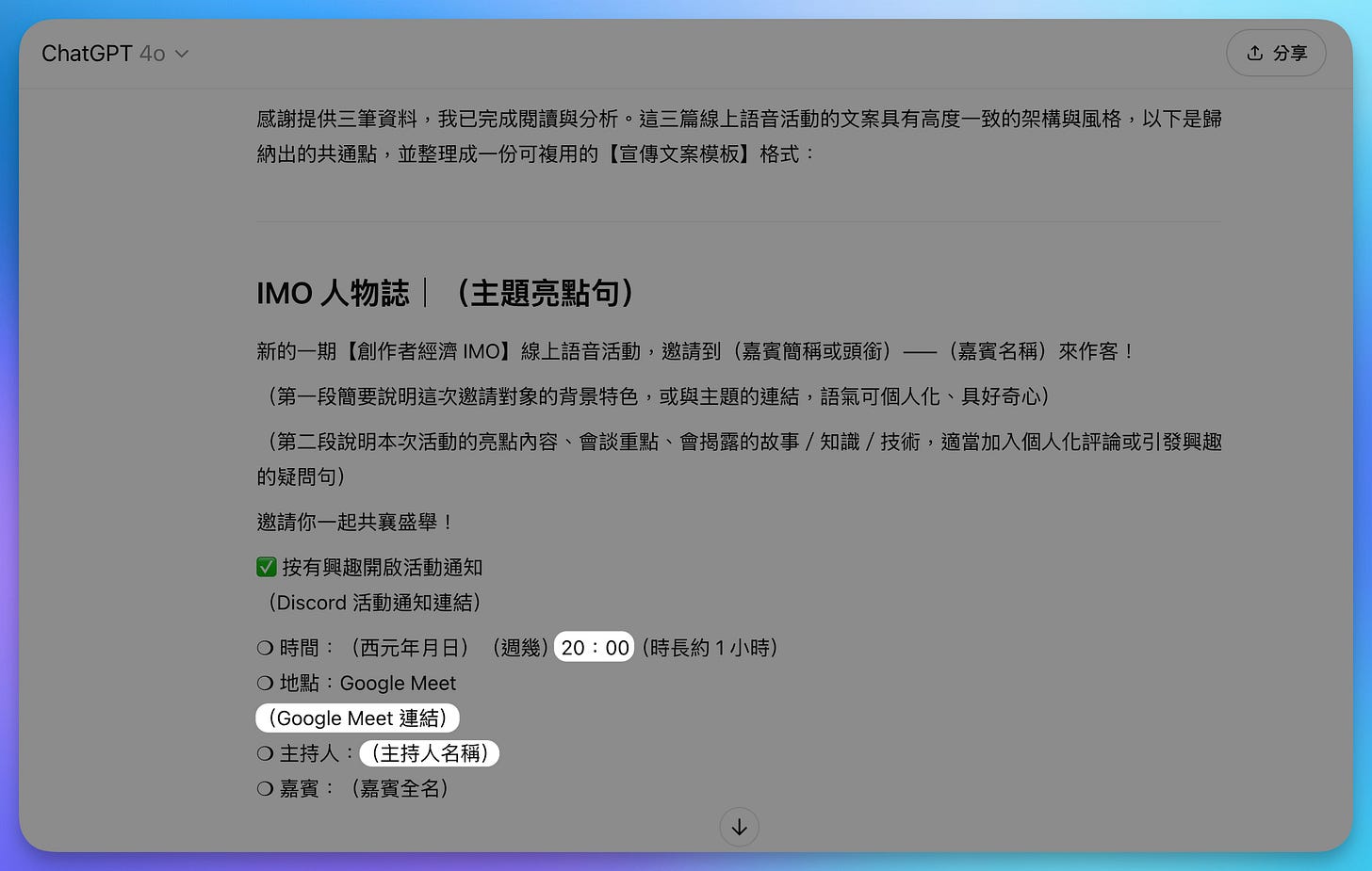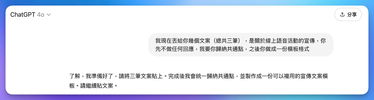 以【創作者經濟 IMO】語音活動文案為例(詳見文末),我希望未來像是交辦任務給部屬那般,只要自然交談,就可以請 AI 寫出具有一致性風格的宣傳文字。