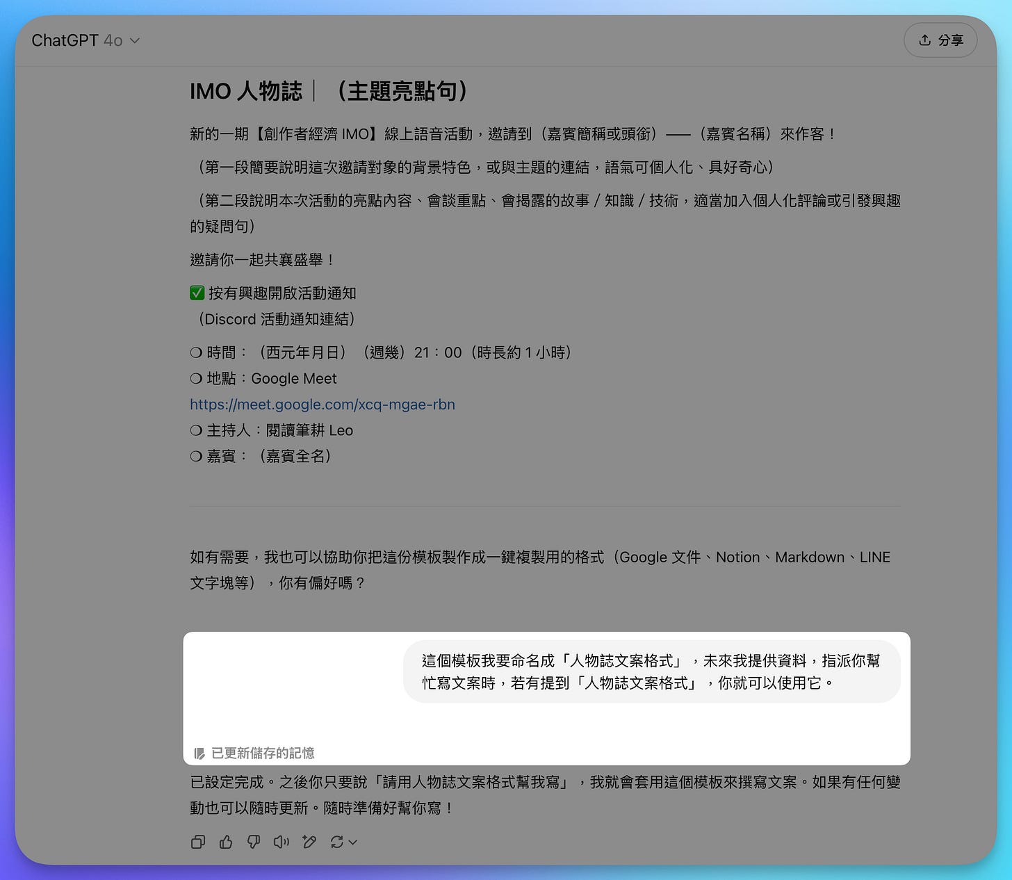 下圖中,我想讓 AI 把最後這段格式——很長的提詞——牢記下來,所以我先幫它取個名字。之後只要叫這個名字,AI 就會自動啟用這提詞內容。