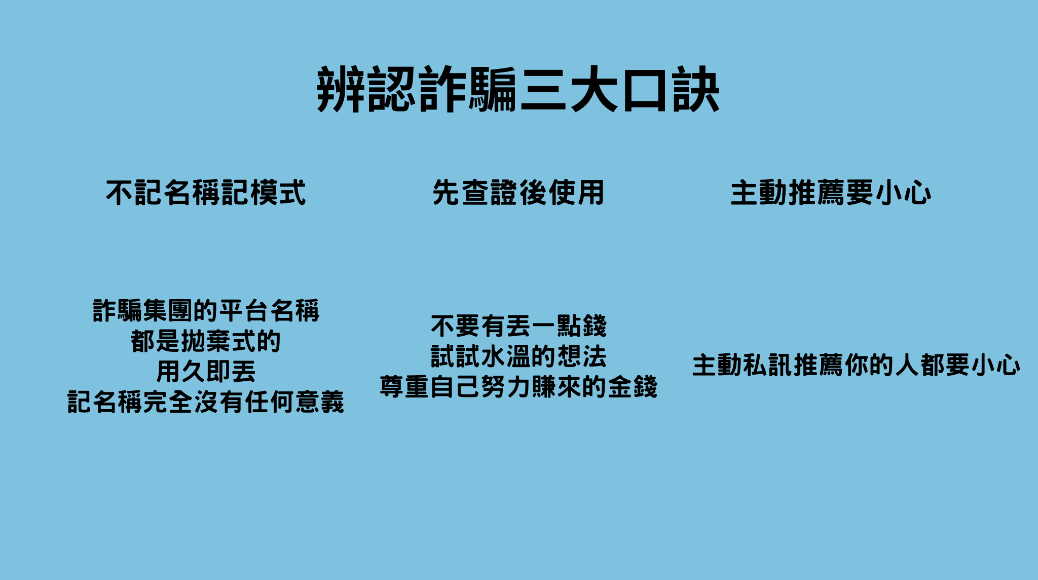 未來只要遇到類似情況,你就能及時踩煞車,不會被包裝漂漂亮亮的假平台給唬住。