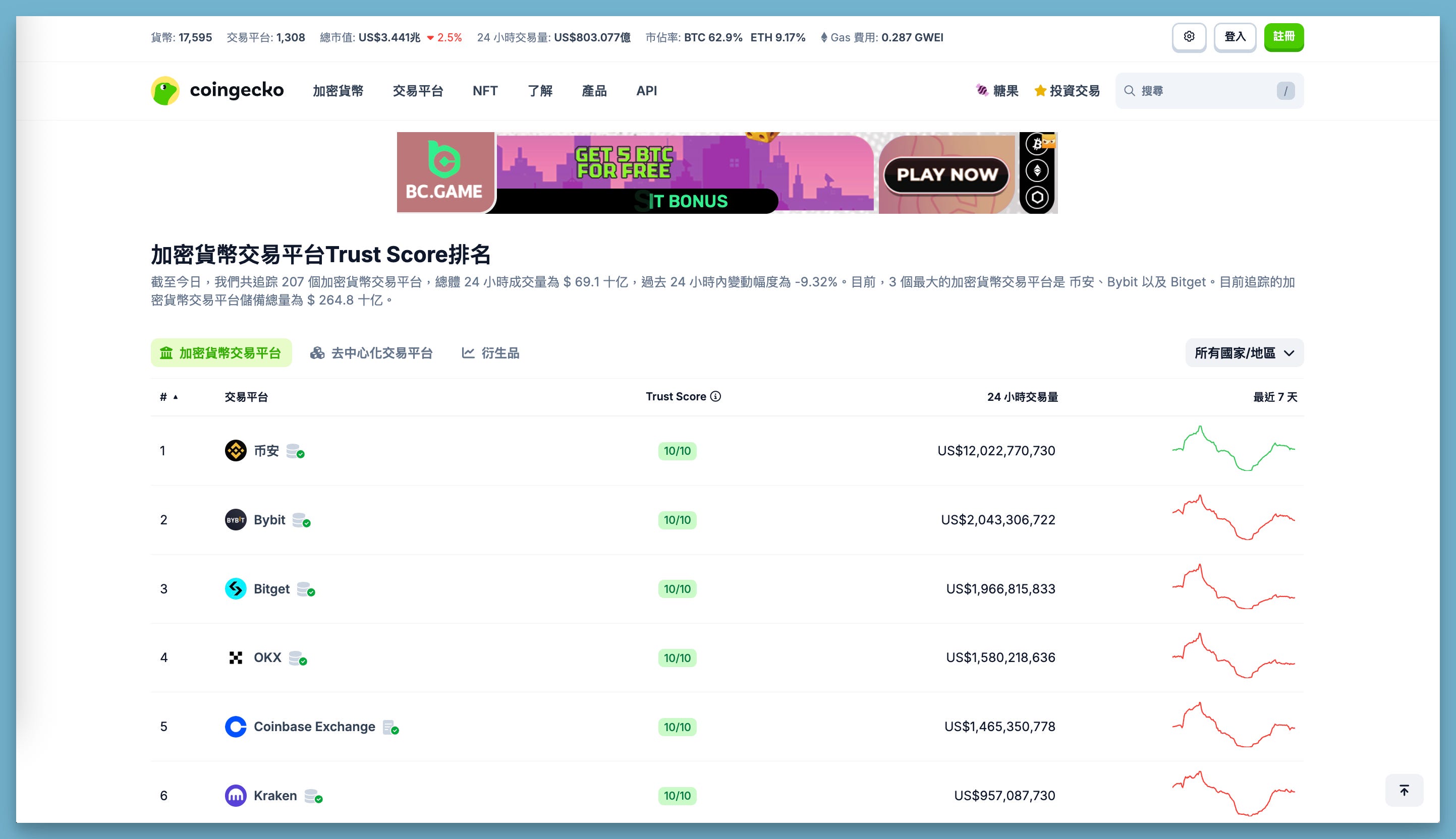 善用 CoinMarketCap、CoinGecko 的加密貨幣交易平台 Trust Score 排名,沒有在排行榜前段班的就不要用。